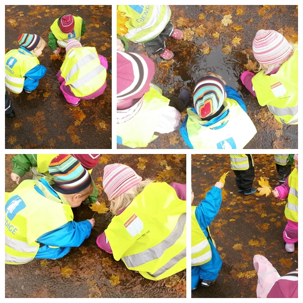 Mens vi ventet på bussen fant barna masse blader på bakken som de viftet med og dyppet i vannet.